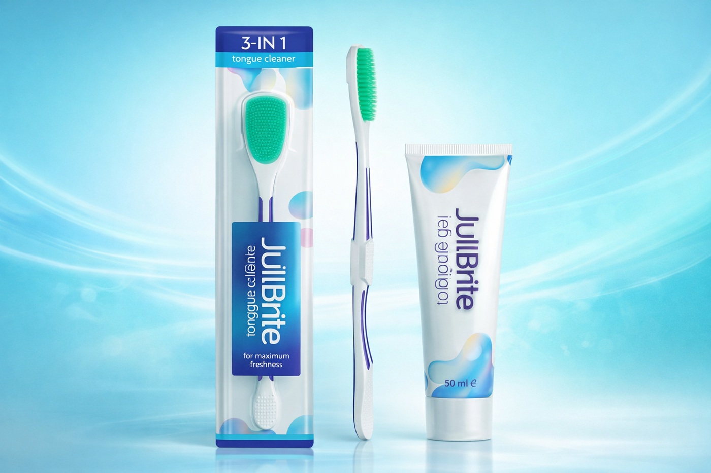 De JuliBrite tongreiniger is een 3-in-1 tongschraper: eerst zacht masseren, daarna aanslag losborstelen en tot slot schrapen. Zo wordt tongbeslag effectief verwijderd, ook achter op de tong.